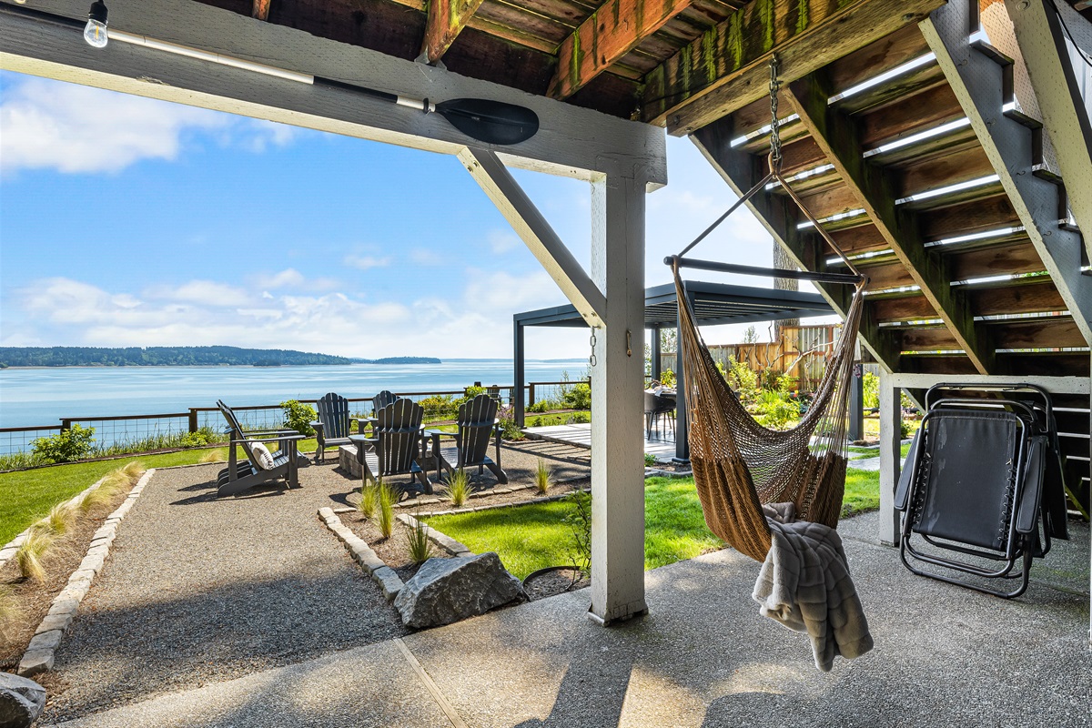 Deck and balcony overlook a garden, fire pit, and the bay. Grill, dine outside, toss a Frisbee, or just sit back and soak it in. The private neighborhood beach is just a 5-minute walk—gate key included.