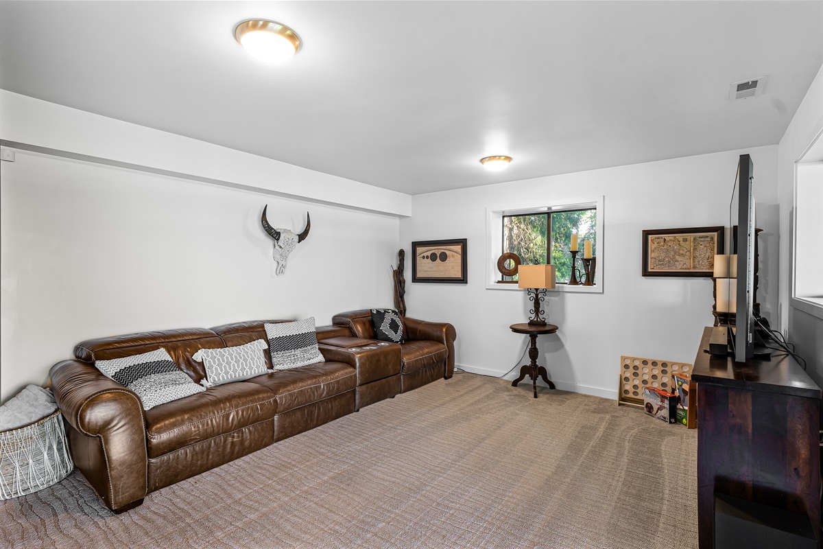 The open living area has hardwood floors, big windows, a cozy bay seat, and an electric fireplace. There’s room to gather—or to escape from the group for a few quiet minutes of sanity.